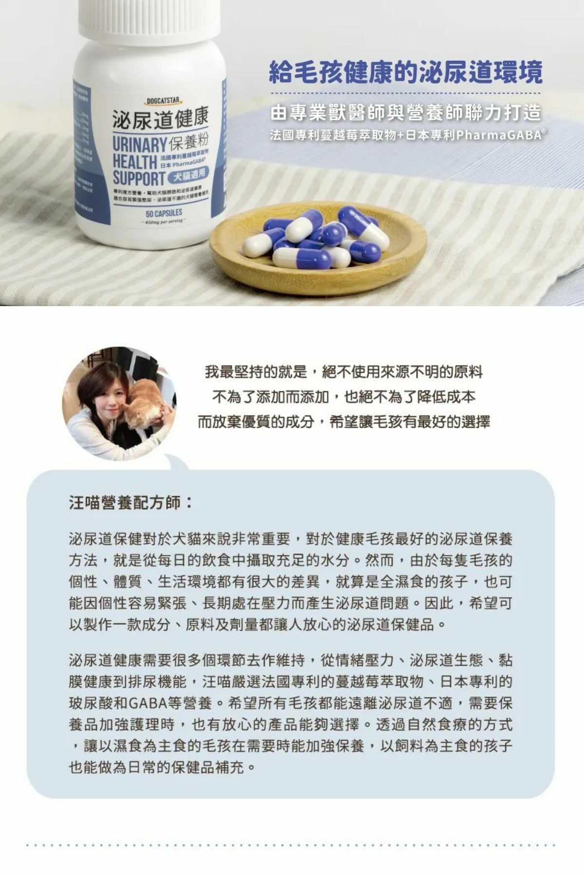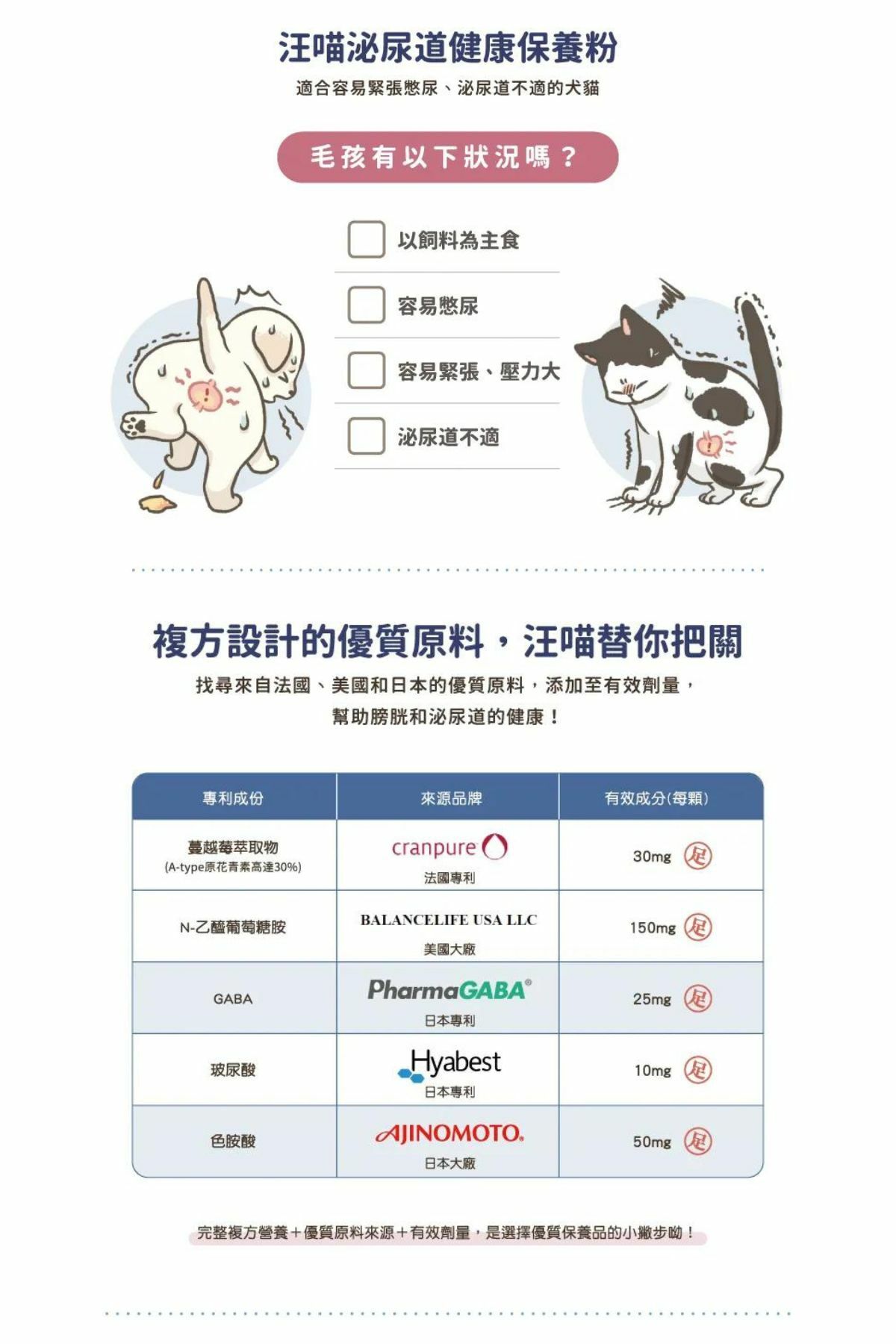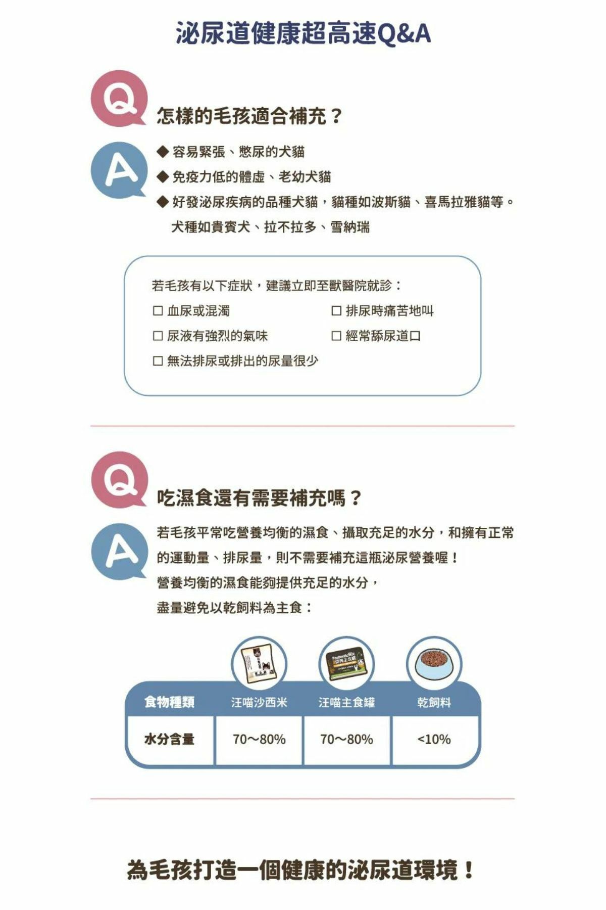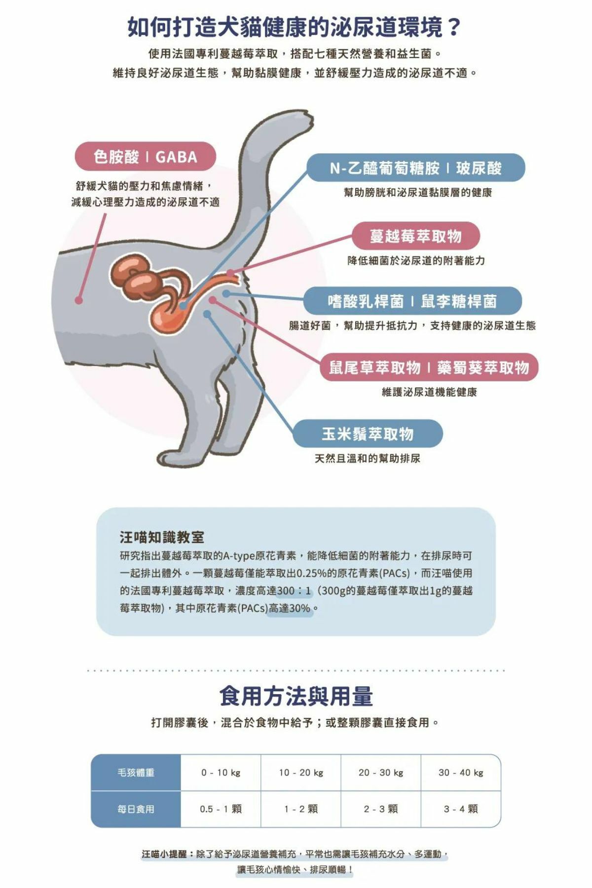 • 犬貓皆適用,建議平常多補充水分,輔以保健品補充泌尿道所需營養