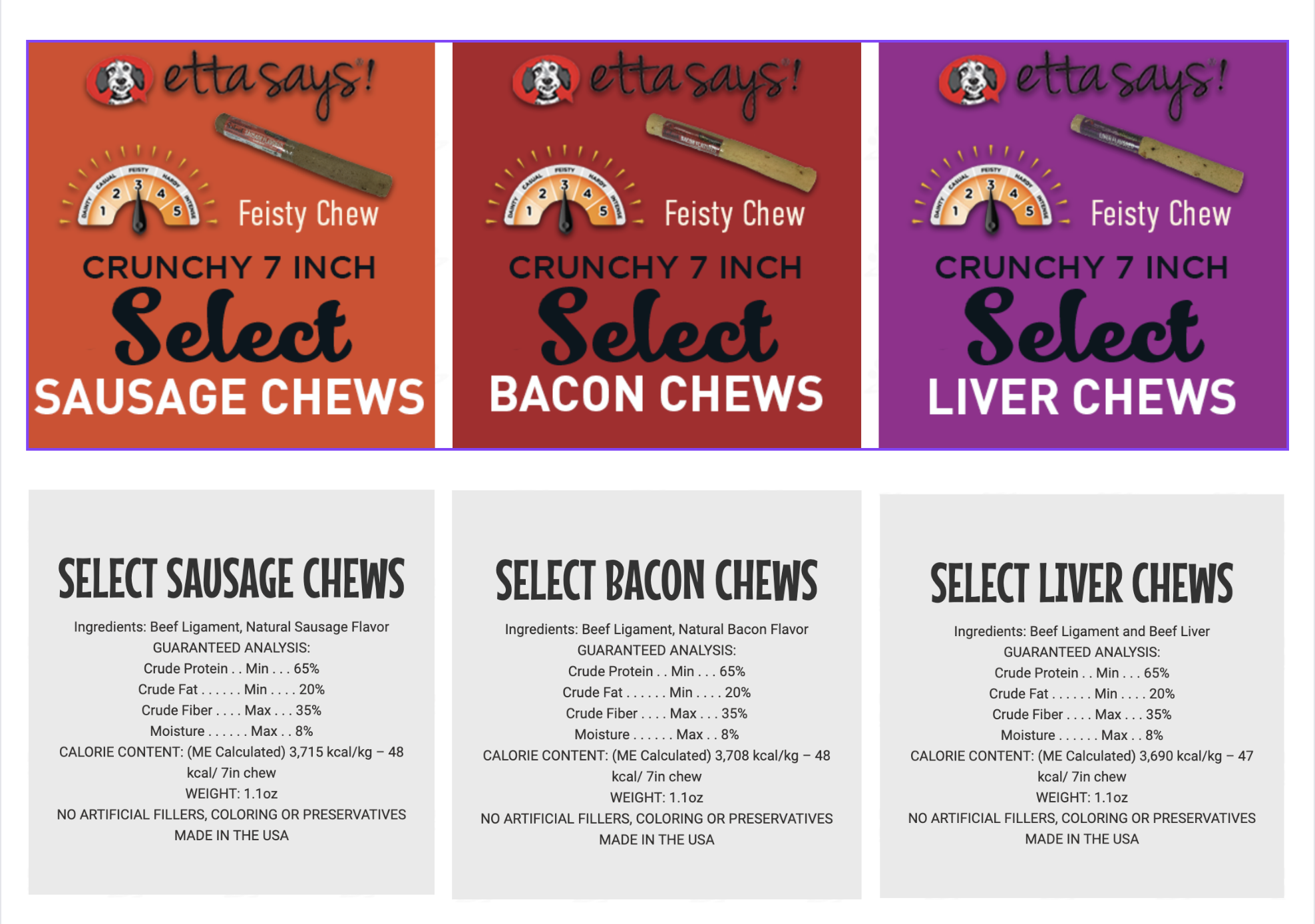 • 僅由兩種成分製成——牛肉韌帶和/或蛋白質和天然香料