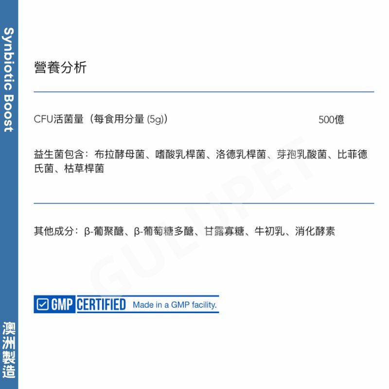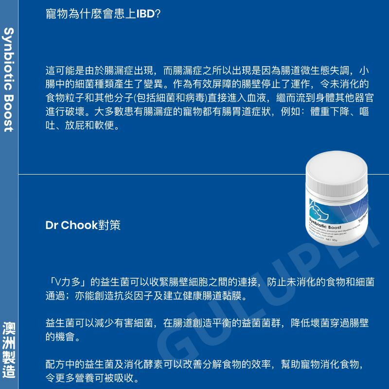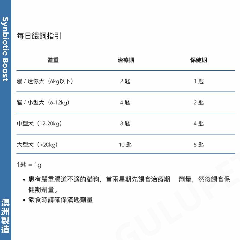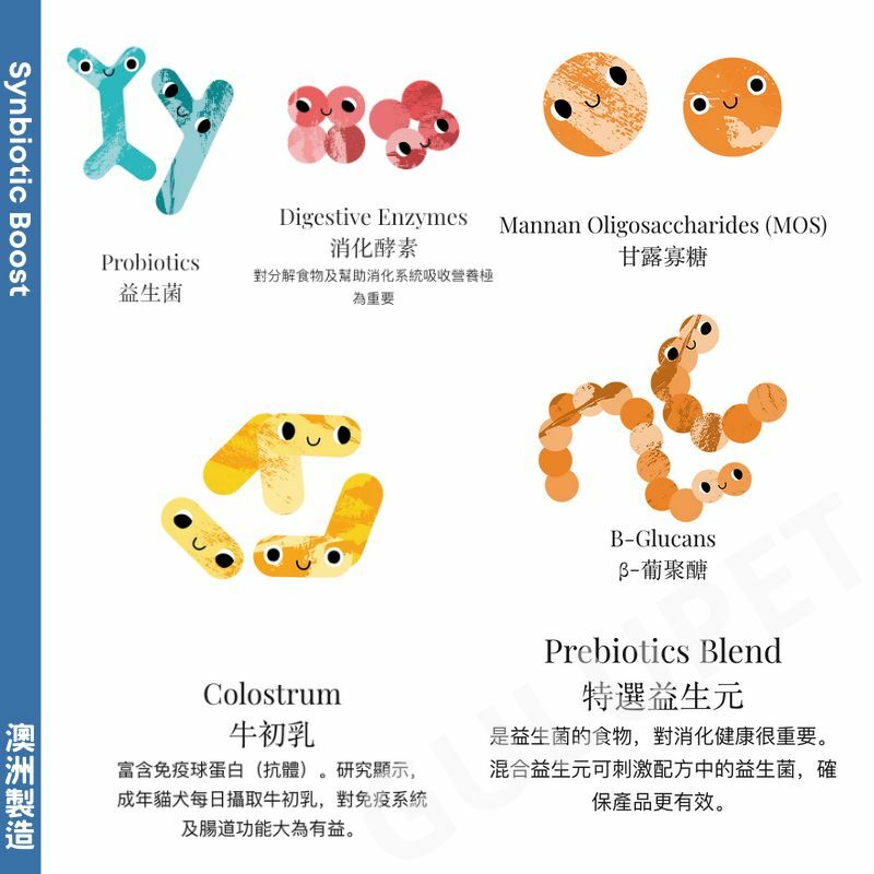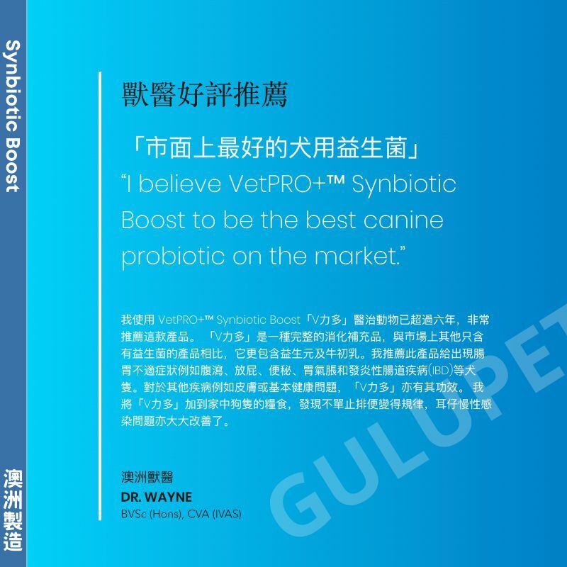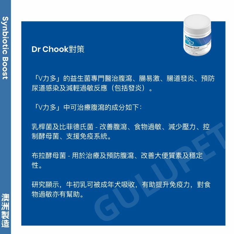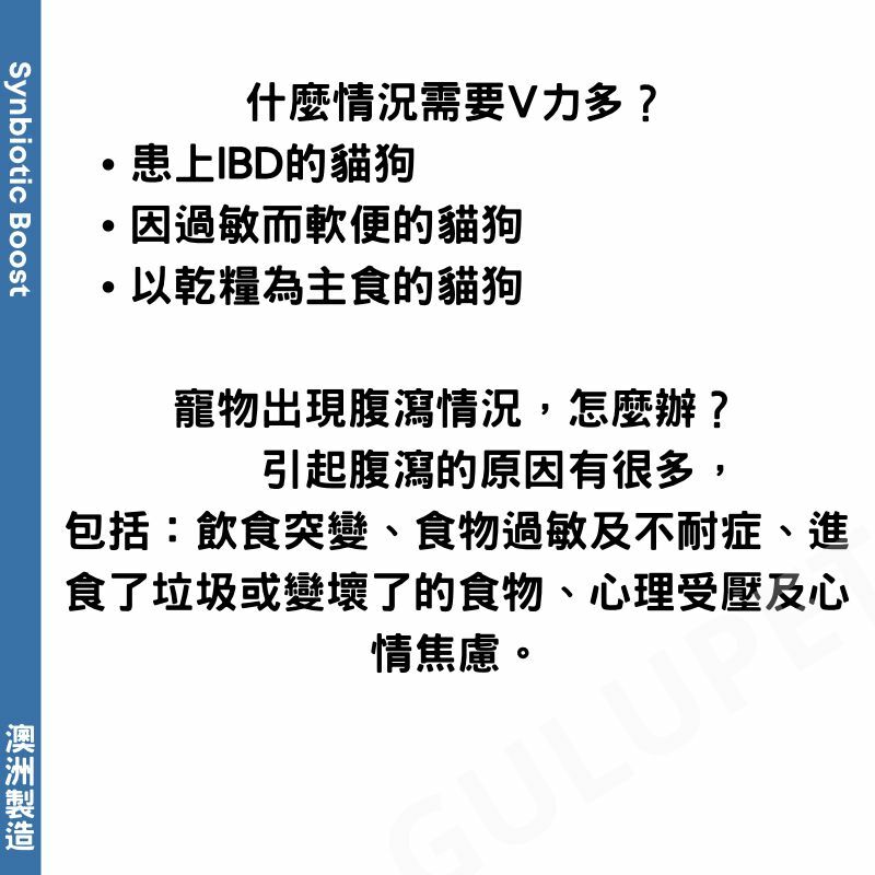 「Synbiotic Boost V 力 多 」 是 一 種優質益生元和益生菌混合配方, 專為改善貓狗腸胃微生態和免疫 系統度身調製。配方含有 500 億 CFU(每 5 克分量)活菌量以及 各種消化酵素、β- 葡聚醣和牛初 乳,有效改善大便質素並促進腸 道菌群的健康。