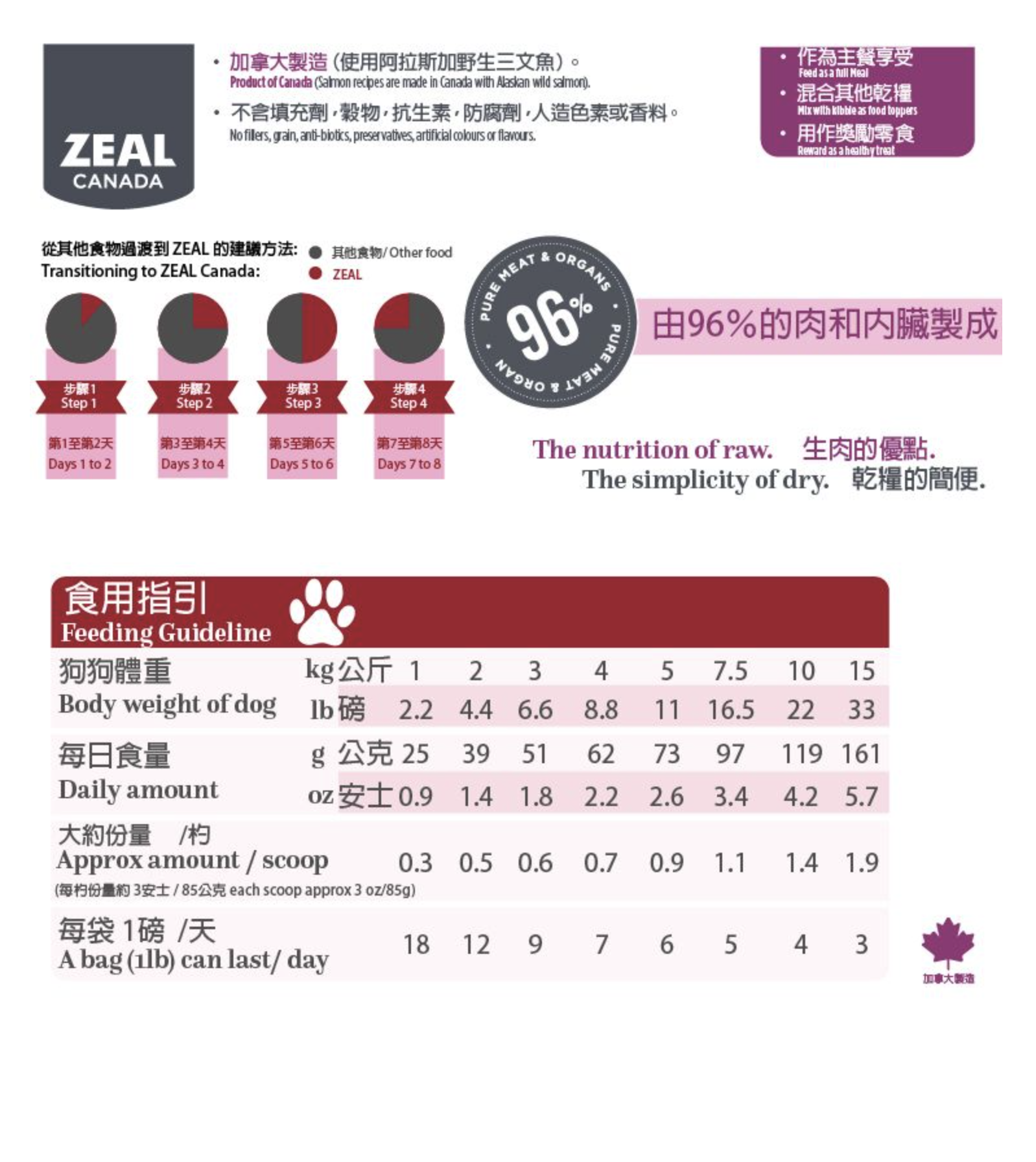 用最優質的肉類和天然原料製成,不含人工添加劑,我們的配方可提供高蛋白質,完整均衡的飲食。 每個配方都具有狗狗喜歡的真正的肉味,絕對適合挑剔的狗狗食家。 濃縮的營養意味著您可以減少餵飼食物並節省更多的的錢。 您可以把美味的 Zeal :