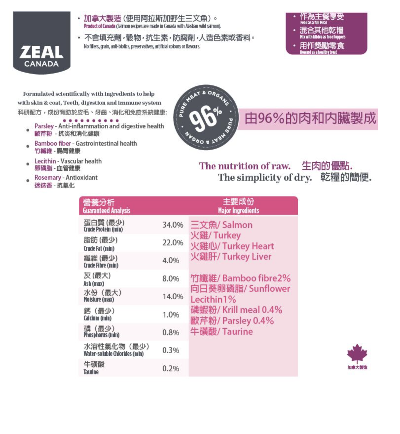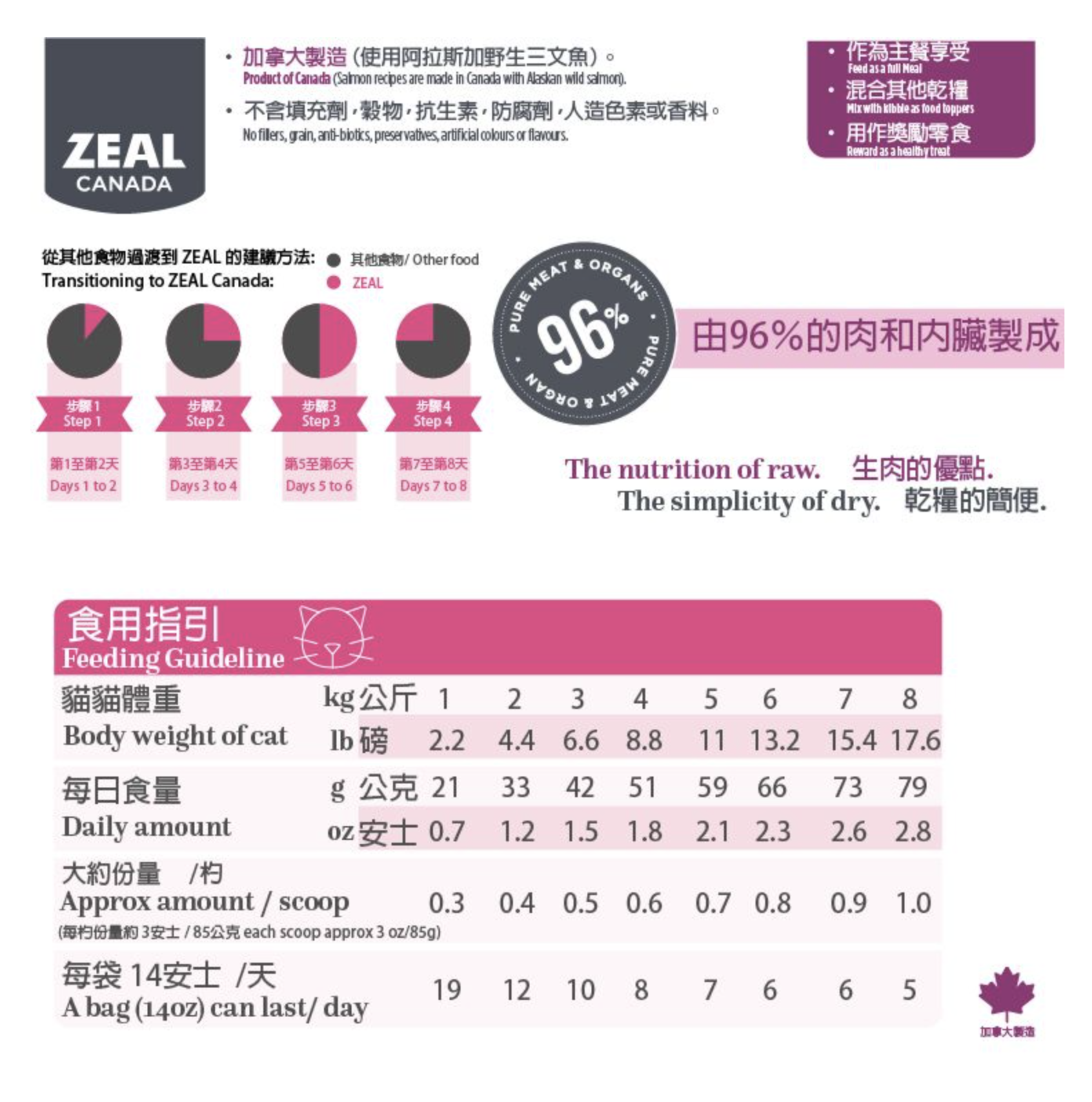 用最優質的肉類和天然原料製成,不含人工添加劑,我們的配方可提供高蛋白質,完整均衡的飲食。 每個配方都具有貓貓喜歡的真正的肉味,絕對適合挑剔的貓貓食家。 濃縮的營養意味著您可以減少餵飼食物並節省更多的的錢。 您可以把美味的 Zeal :