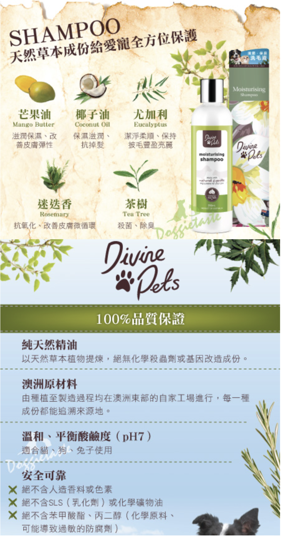 Formulated with seven different natural essential oils, Divine Pets Moisturizing Shampoo provides superior cleansing and moisturizing properties, leaving coat tangle-free and shiny.