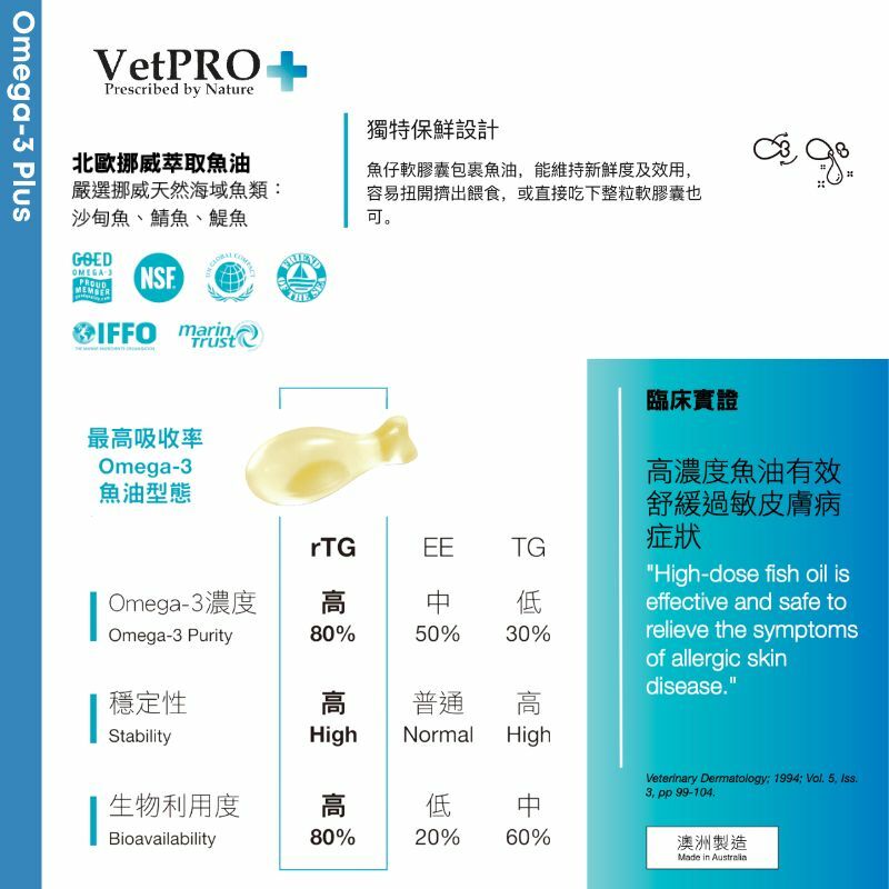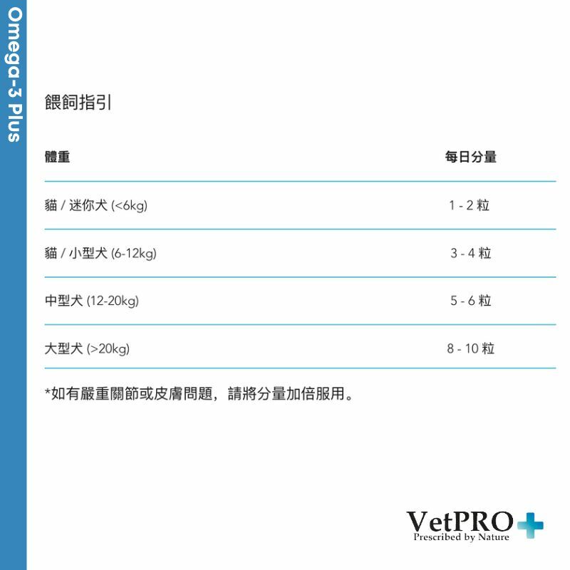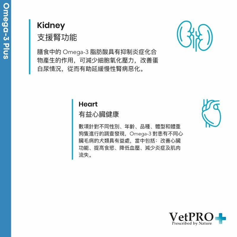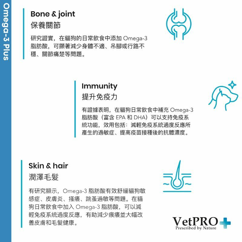 「Omega-3 Plus 魚油加餐」含有 高濃度天然 rTG 型 Omega-3, 有效讓寵物身體吸收利用。豐 富 EPA 與 DHA 幫助保健關節、 提高認知能力、改善腎臟、血管 和心臟健康。保持 Omega-3 和 Omega-6 比例均衡,對降低體內 發炎水平非常重要。